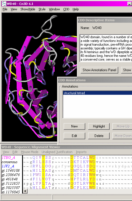 Cn3D is a helper application for your web browser that allows you to view 3-dimensional structures from NCBI's Entrez retrieval service. Cn3D runs on Windows, Macintosh, and Unix. Cn3D simultaneously displays structure, sequence, and alignment, and now has powerful annotation and alignment editing features.
