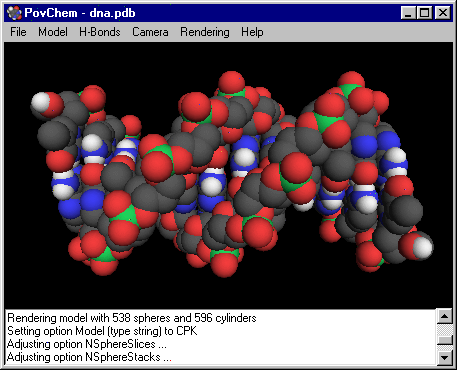 It's a chemical visualization and illustration program with a new graphic interface. It takes molecules in the PDB format, lets you to set up a picture with fine control over details of the illustration - colors, atom and bond radii, view orientation, etc. It will even calculate and display hydrogen bonds. It then exports the picture in POV-Ray format, which allows you to render the image with a state-of-the-art raytracer, giving high-quality images at any resolution, for anything from web page thumbnails to full-size high-resolution images for journal covers, advertisements, posters, anything!
