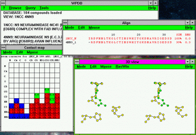 The PDB through Microsoft Windows, or WPDB for short, is a Microsoft Windows 3.1 Windows95 and Windows NT (client and server) based program to interrogate the 3-dimensional structure of biological macromolecules as found in the Protein Data Bank (PDB) using query and display tools like those shown above.