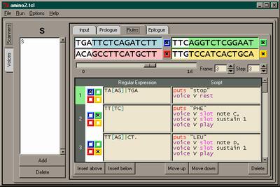 dna2abc is a Tcl/Tk application for turning DNA sequences into musical sequences. The core of the application is an editor for a list of rules. Each rule consists of a regular expression and a Tcl script. As dna2abc scans along the input DNA sequence, each rule is tested against a portion of the sequence, and, if the regular expression matches, the corresponding Tcl script is executed.