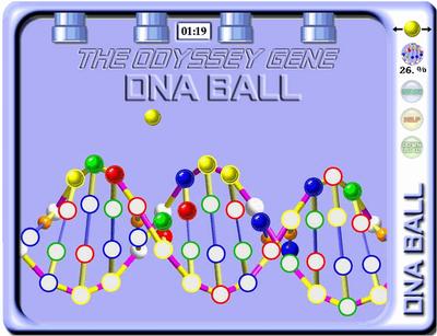 Gaming software. Use the arrow to drive a colored ball into a DNA skeleton and to fill all positions. The game is timed and the speed of release of the balls increases with time. The DNA BALL game was created to accompany a new book, "The Odyssey Gene".