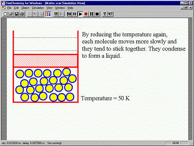 SimChemistry for Windows allows you to set up, run and interactively modify simulations on your PC representing microscopic physical systems. You can play existing demo simulations (including those supplied) to learn about the molecular-level behaviour behind macroscopic chemical phenomena, or record your own to show others.