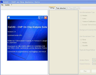 High-density tiling microarrays are increasingly used in combination with ChIP assays to study transcriptional regulation. To ease the analysis of the large amounts of data generated by this approach, we have developed ChIP-on-chip Analysis Suite (CoCAS), a standalone software suite which implements optimized ChIP-on-chip data normalization, improved peak detection, as well as quality control reports. Our software allows dye swap, replicate correlation and connects easily with genome browsers and other peak detection algorithms. CoCAS can readily be used on the latest generation of Agilent high-density arrays. Also, the implemented peak detection methods are suitable for other datasets, including ChIP-Seq output.