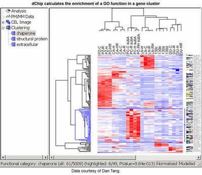 DNA-Chip Analyzer (dChip) (www.dchip.org) is a Windows software package for probe-level and high-level analysis of Affymetrix gene expression microarrays and SNP microarrays (Li and Wong 2001a, Lin et al. 2004). Gene expression or SNP data from other microarray platforms can also be analyzed by importing as external dataset. At the probe level, dChip can display and normalize the CEL files, and the model-based approach allows pooling information across multiple arrays and automatic probe selection to handle cross-hybridization and image contamination. High-level analysis in dChip includes comparing samples, hierarchical clustering, view expression and SNP data along chromosome, LOH and copy number analysis of SNP arrays, and linkage analysis. In these functions the gene information and sample information are correlated with the analysis results.