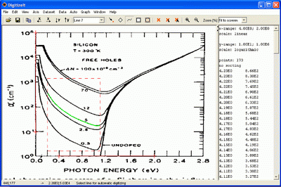 DigitizeIt digitizer software replaces a digitizer tablet. Sometimes it is necessary to extract data values from graphs, e.g. in most scientific publications only plots but no data values are published. DigitizeIt makes it easy to actually get back numbers from such a plot! This is a three step process: a) import the graph from a file or copy it over the clipboard, b) define the axes system, c) digitize it automatically or manually. Data values can then be saved in ASCII format or copy & pasted directly into any other application, e.g. MS Excel or Microcal Origin.