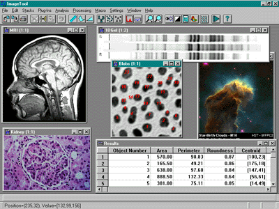 UTHSCSA ImageTool (IT) is a free image processing and analysis program for Microsoft Windows 9x, Windows ME or Windows NT. IT can acquire, display, edit, analyze, process, compress, save and print gray scale and color images.IT can read and write over 22 common file formats including BMP, PCX, TIF, GIF and JPEG. Image analysis functions include dimensional (distance, angle, perimeter, area) and gray scale measurements (point, line and area histogram with statistics). ImageTool supports standard image processing functions such as contrast manipulation, sharpening, smoothing, edge detection, median filtering and spatial convolutions with user-defined convolution masks. IT also has built-in scripting capabilities that allow the user to record repetitive tasks and playback saved scripts to automate image analysis.