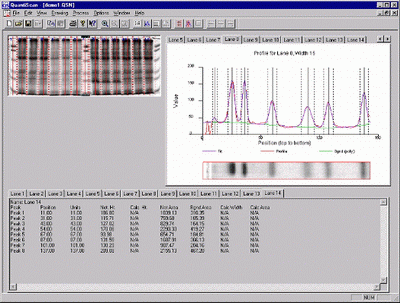 QuantiScan for Windows has similar functionality to sophisticated densitometers but at a fraction of the cost. It is able to analyze a wide variety of material including polyacrylamide and agarose gels, autoradiograms, TLC plates, etc. The program will accept images for analysis directly from any TWAIN compliant scanner as well as most BMP, JPG or uncompressed TIF files. For laned gels of reasonable quality, the analysis is highly automated, allowing extremely high throughput of data. Almost any type of image can be analyzed with the manual modes of Quantiscan. Images can be pre-processed in a variety of ways within QuantiScan including crop, flip, invert, scroll and zoom.