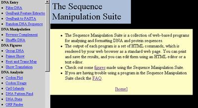 The Sequence Manipulation Suite is a collection of JavaScript programs for generating, formatting, and analyzing short DNA and protein sequences. It is commonly used by molecular biologists, for teaching, and for program and algorithm testing.