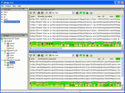 Multiple alignment and editor using DCA, CLUSTAL-W, T-COFFEE, and DIALIGN. QAlign provides a practical solution for the creation of high-quality multiple alignments: layouts produced by automated methods may be used as a starting-point for manual changes, whereas the phylogenetic consequences are visualized on the fly. The standalone software package combines various alignment algorithms with a versatile editor and a dynamic phylogenetic analysis to provide a convenient graphical user interface. In addition to the traditional alignment strategies of fast progressive (Clustal W) and more accurate simultaneous multiple alignment (DCA), QAlign includes iterative and consistency-based state-of-the-art extensions, which recently have shown much promise (T-coffee and DIALIGN). Thus, after providing the input sequences (FASTA and MSF format) and selecting the evolutionary model (PAM, BLOSUM, DNA/RNA), the user may choose from a list of strategies/algorithms that one which suits the problem best. However, even these layouts may need some manual editing. Therefore, the graphical editor of QAlign provides all features needed to support convenient editing. A dynamical consensus is updated on every edit event, visualizing the strength of each character in an easy coloring scheme. Furthermore, a phylogenetic analysis of the current alignment layout is created interactively (using the neighbor-joining method), which may be refined (e.g. by applying bootstrapping techniques) and exported (NEWICK and SVG or WMF vector-format)