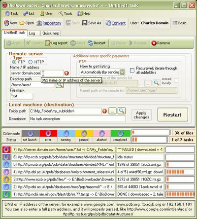 BioDownloader is a program for downloading and/or updating files from ftp/http servers. The program has unique features that are specifically designed to deal with bioinformatics data files and servers: