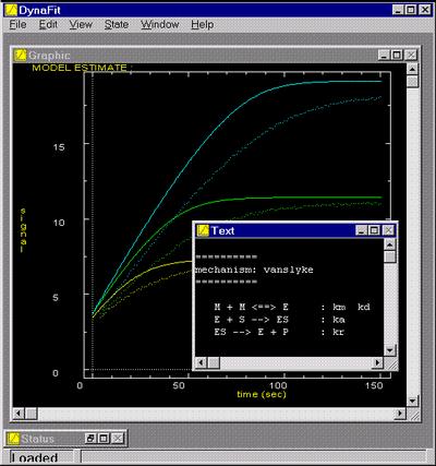 The main purpose of the program DynaFit is to perform nonlinear least-squares regression of chemical kinetic, enzyme kinetic, or ligand-receptor binding data. The experimental data can be either initial reaction velocities in dependence on the concentration of varied species (e.g., inhibitor concentration vs. velocity), or the reaction progress curves (e.g., time vs. absorbance).