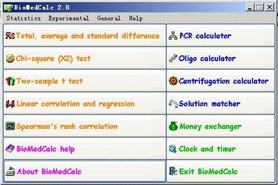 用于生物學和醫(yī)學計算的生物信息學軟件。能夠進行總和、均數(shù)和標準差、t檢驗、卡方檢驗、直線相關與回歸和Spearman檢驗等生物醫(yī)學常用的統(tǒng)計分析。含有PCR計算器、寡核苷酸計算器、離心計算器、溶液配制計算器、外匯計算器和定時器等功能。圖形化界面直觀友好,使用簡便。適合對病例檢測結(jié)果的統(tǒng)計分析和輔助細胞和分子生物學實驗。尤其適用于病理研究。BioMedCalc 是免費軟件。作者Email: xhsi@vip.sina.com。