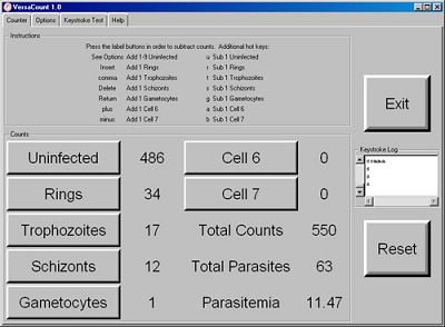 ersaCount is a simple application to assist with the counting of cells by microscopy. When used with a numeric keypad, it can significantly increase counting efficiency when compared with a traditional clicker. Although it was designed for malaria work, it can be customized for a wide variety of cell counting applications.