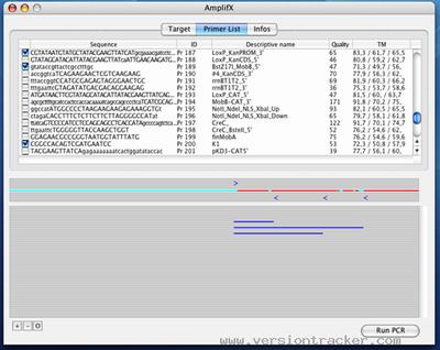 The main purpose of AmplifX is to seek in a collection of primers, such as any molecular biologist get in his refrigerators, those which can be use to amplify a fragment into a target sequence, for example, and particularly, to design strategies to screen recombinant clones by PCR. Some informations are associated with each primer, some automaticelly computed by AmplifX (like TM, Quality, length) and others given by the user (name, comments,...) This allows general aspects of primer management (sequences and real tubes). AmplifX can also design new primers.