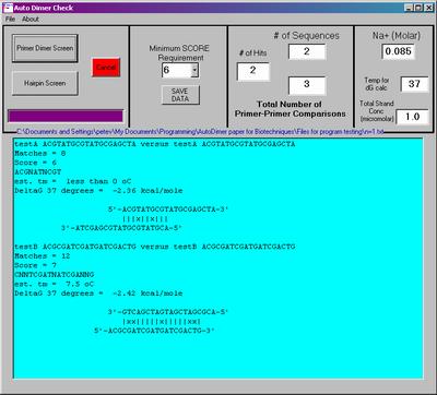 AutoDimer software was developed to rapidly screen previously selected PCR primers for primer-dimer and hairpin interactions in short DNA oligomers (< 30 nucleotides). AutoDimer was originally created to assist in the development of multiplex PCR assays for probing STR and SNP markers for forensic purposes.