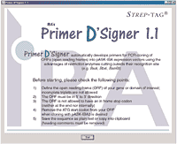 The easy-to-handle software reduces boring primer design work to several mouse clicks only. It checks the reading frame, looks for gene internal restriction sites and provides the optimal cloning strategy. Therefore, Primer D'Signer 1.1 is extremely convenient for all Strep-tag/6xHistidine-tag expression system users interested in e.g. the expression of authentic proteins.