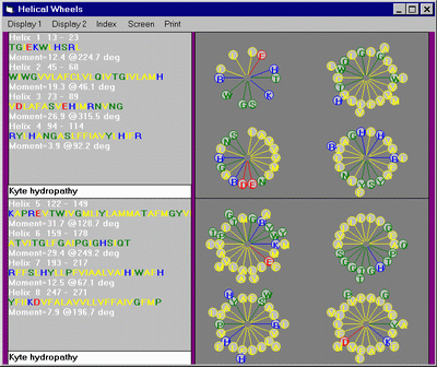 The main PSAAM program includes many useful features for analysis of structural information from sequence data, cartoons for graphical representation of secondary structures, prediction programs, and prediction aids, a ribosome function for generation of coordinates sets in PDB format (including Header information) for viewing by molecular graphics packages (examples, see also PDVWIN), and a SeqPlot function for plotting secondary structural models (helical cylinders and wheels, coils, etc., with each residue indicated by a circle, color-coded (or coded by line thickness) according to the current physico-chemical index. This latter function can be used to make "helical cylinder models".