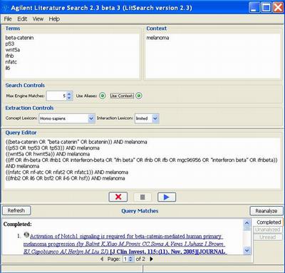 Agilent Literature Search Software provides an easy-to-use interface to its powerful querying capabilities. When a query is entered, it is submitted to multiple user-selected search engines, and the retrieved results (documents) are fetched from their respective sources. Each document is then parsed into sentences and analyzed for protein-protein associations. Agilent Literature Search Software uses a set of "context" files (lexicons) for defining protein names (and aliases) and association terms (verbs) of interest. Associations extracted from these documents are then converted into ALFA relations, which are further grouped into an ALFA network. The sentences and source hyperlinks for each association are further stored as attributes of the corresponding ALFA relations.