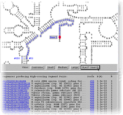 a Java applet for viewing RNA secondary structures and linking to multiple computational backends. SStructView 1.2 is available. This version supports colored bases, standard mouse selection mechanisms (drag to select a range, control-click to select individuals), arbitrary set-based data types to allow you to create your own groups, and other improvements.